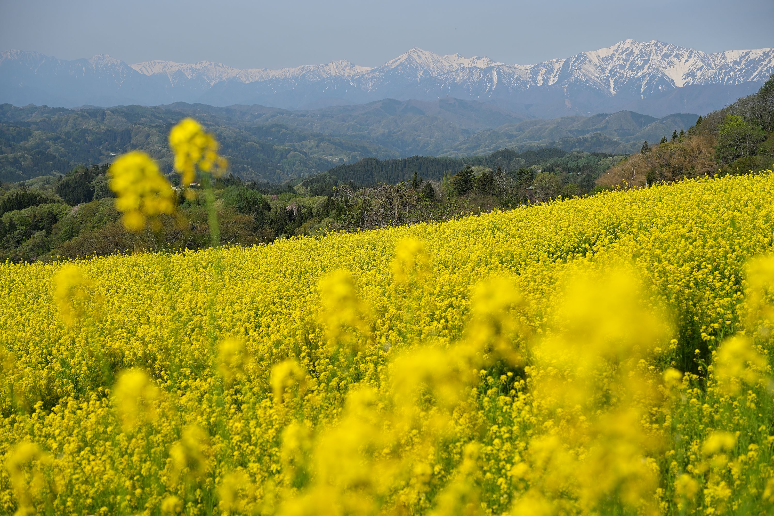09:30 アルプス展望広場夢の駅 菜の花畑と北アルプスの風景 散策
